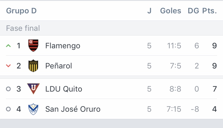 Por su lado Liga de Quito debe ganar sí o sí el partido vs San José (BOL) (miércoles 19:30 hora Ecuador) en el estadio Rodrigo Paz. En el caso de que en el otro partido del grupo D Peñarol (URU) vs Flamengo (BRA) haya una victoria de cualquier equipo, Liga logrando la victoria se llevaría la clasificación a octavos de final logrando 10 puntos. Si en Montevideo hay un empate, Liga debe ganar su partido por 2 goles o más de diferencia, en el único escenario en que los albos no clasifiquen con un empate entre uruguayos y brasileños es si el marcador termina 4-4 y Liga gana sólo por dos goles de diferencia.