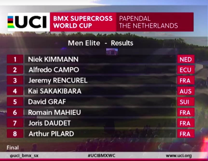 Hoy se llevó a cabo la ronda 3 de la Copa del Mundo de BMX en Papendal, Holanda. El ecuatoriano Alfredo Campo logró pasar la ronda 1, octavos de final, cuartos de final y semifinal sin ningún problema y con eso se ganó un lugar para participar en la final de la ronda.