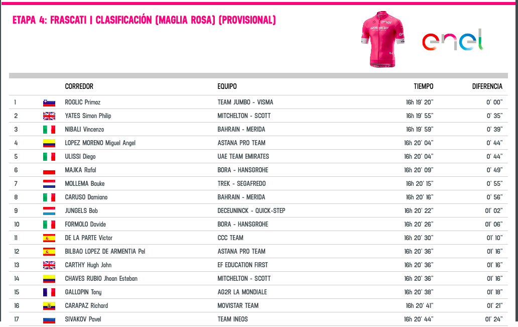 Roglic se encontraba en el grupo junto a Carapaz, llegó 2 segundos después del carchense pero la bonificación de 10 segundos por ganar la etapa hizo que la diferencia que recortó sea de 12 segundos.