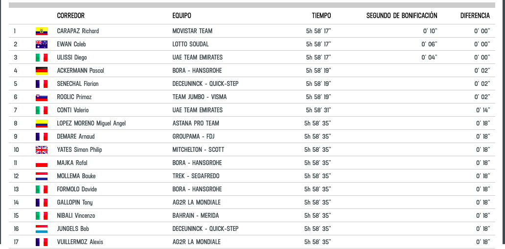 Richard marcó un tiempo de 5h58m17s que lo ayudó a subir 22 puestos en la tabla general, está a 1m12s del líder. Fue el único de los favoritos en poder recortar tiempo al dueño de la maglia rosa, Primoz Roglic, fueron 12 segundos.