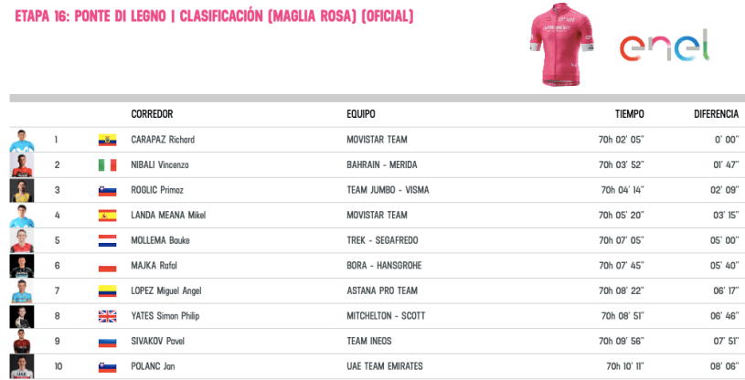 Quien no tuvo una buena etapa fue Primoz Roglic, no pudo seguir el ritmo del grupo donde se encontraba Carpaz y perdió el segundo lugar en la general en la que ahora se coloca tercero.