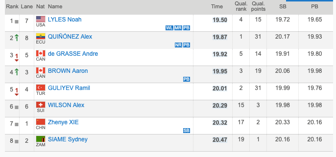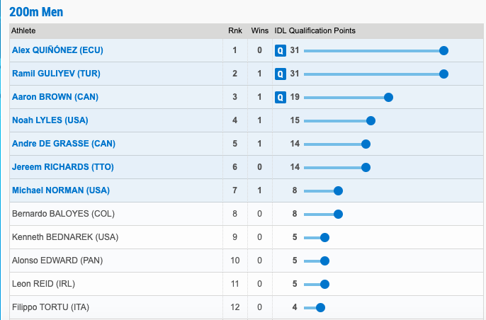 Con este resultado el esmeraldeño sumó 7 puntos que le permitieron subir hasta el primer lugar de la tabla general de los 200 metros en la Diamond League. Tiene los mismos puntos que el turco Ramil Guliyev.